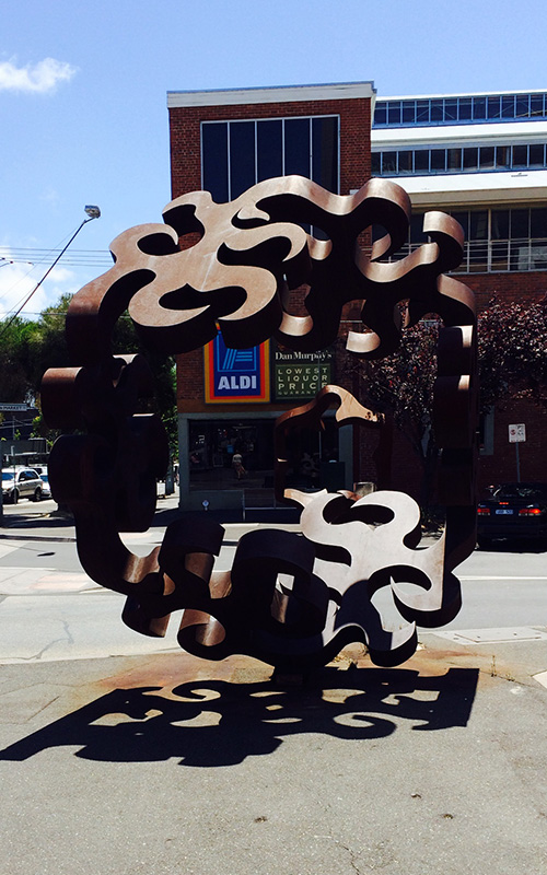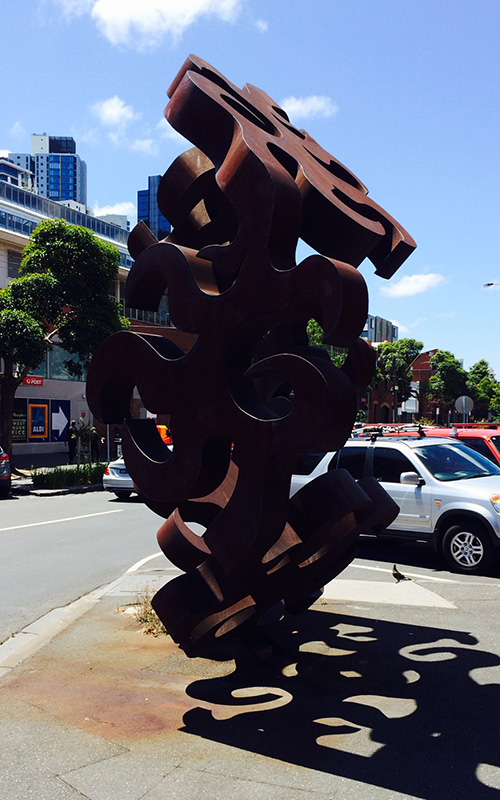 “Swirling Mandala” is also a large public sculpture. At four metres high, consideration of scale to the site has been given, an important factor in placing sculpture in the public arena. The sculpture is made from Corten steel, which ages to many of the colours we see in our landscape, as such I believe it is a material well suited to Australia. It also has a softness and a colour contrast to our city landscapes which introduces a sense of the organic to our often rigid inner city environments.
